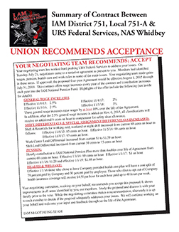 | July 24 2015 - Member Ratify New Agreement On July 24, URS members who maintain EA18G Growlers on NAS Whidbey Island ratified a new four-year agreement. The agreement contained a total of 10% in general wage increases over the 4 years, increases to the IAM National Pension Plan of .20 cents per year bringing the contribution during the agreement to $1.40 per hour. Improvements were made to the cost split in healthcare. Vacation/sick leave/administrative leave were combined into PTO. And work rules were improved. The bargaining committee worked hard, kept the membership unified and made sure every member knew what was at stake. Great job IAM 751 members at URS! Way to stick together and speak with one voice. July 22nd 2015 - Tentative